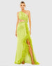 This one shoulder dress features a unique key hole detail and is lined with luxurious feather accents. The sleek cut-out design adds an edgy touch to the stylish one shoulder neckline.