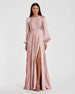 Long sleeve pleated gown with a high neckline, blouson sleeves, pleated bodice, and a thigh-high slit.