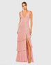 Stunning sequin gown with v-neckline, tiered ruffle skirt, and thigh-high slit.