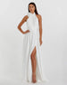 Elegant chiffon gown with a ruched bodice and waistband, an open back, and a rosette halter neckline. The flowing floor-length skirt features a thigh-high slit.