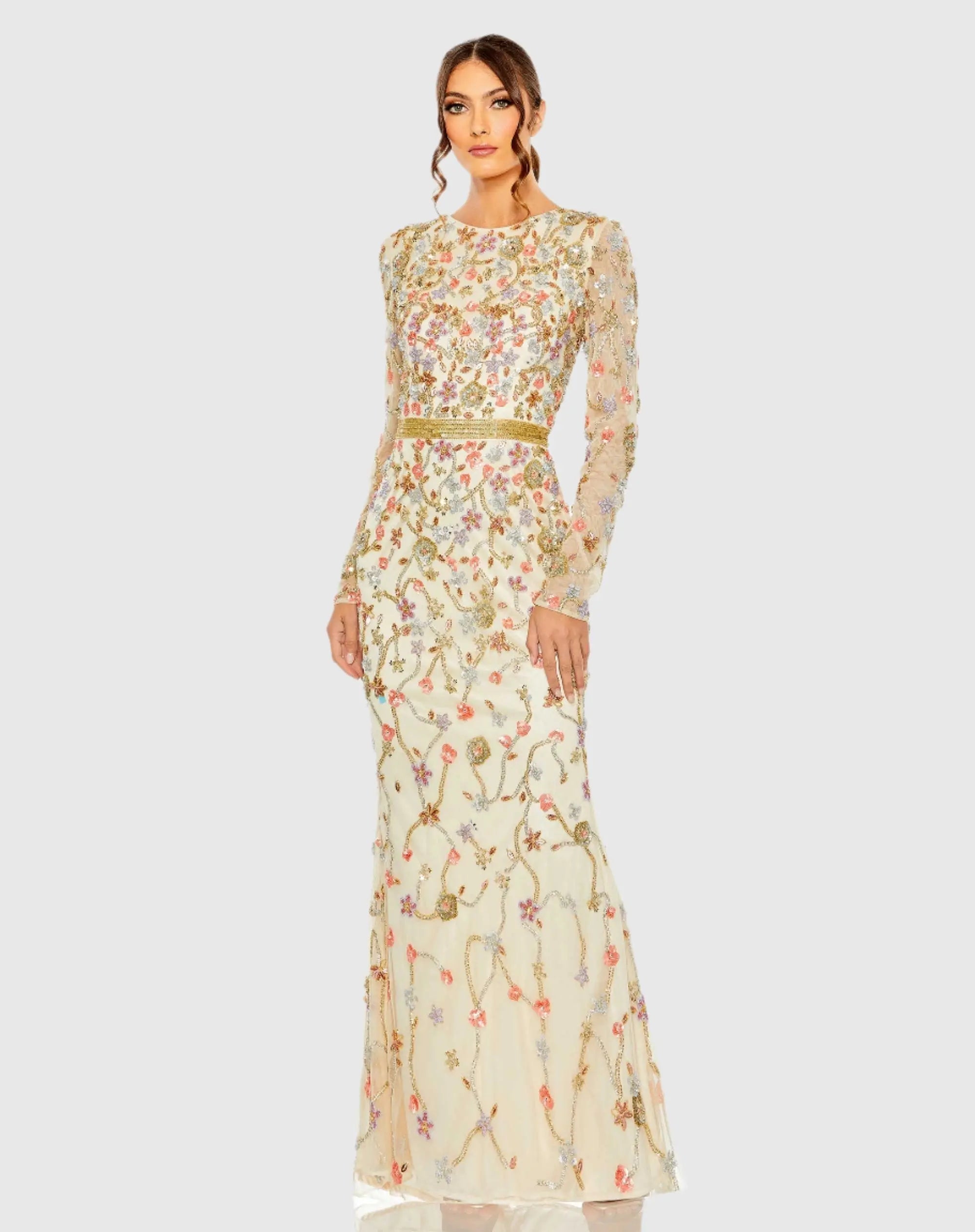 - Long sheer beaded sleeves