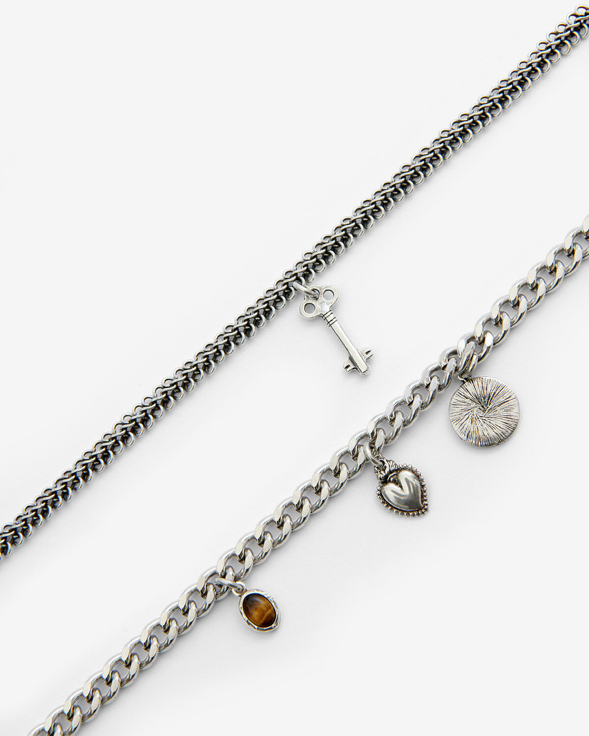 Pendants in the shape of a key, tooth, heart, medal, stone, and twisted ring