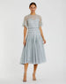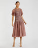 Exquisite hand-embellished mesh overlay dress, featuring a partially lined bodice and a fully lined skirt for a sleek fit. The sheer unlined sleeves add a delicate touch, while the high neckline with an illusion high neck overlay creates a sophisticated, dramatic look. Short flounce sleeves and a rhinestone-encrusted waist detail complete the design, making this dress perfect for formal events, galas, or evening soirées.