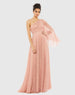 One-shoulder floor length gown with dramatic bell sleeve and hand-beaded belt.