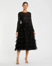 Chic tea-length dress with a sequined bodice, long sleeves, and a round neckline. A-line skirt features black layered tulle, and hand-beaded belt accents the natural waist.