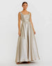 Shine at any formal event in our elegant Ballgown. Featuring a square neckline, sleeveless design, and pleated metallic fabric for a stunning shimmer. The intricately pleated bodice adds texture and dimension, making this gown the perfect choice for a memorable, sophisticated look.