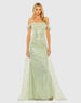 This gown features an off-the-shoulder neckline for an elegant touch. The sequin panel and dramatic overskirt/train add a stunning, unique flair, making it the perfect choice for any formal occasion.