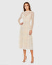 This stunning midi dress features ruffled high neckline, long sheer sleeves, and intricate hand-stitched sequin detailing.