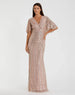 Elevate your evening look with our Sequined V Neck Cape Sleeve Column Gown. The sophisticated column silhouette flatters your figure, while the v-neckline adds a touch of elegance. The short flutter sleeves provide the perfect balance of coverage and comfort. Perfect for any special occasion.